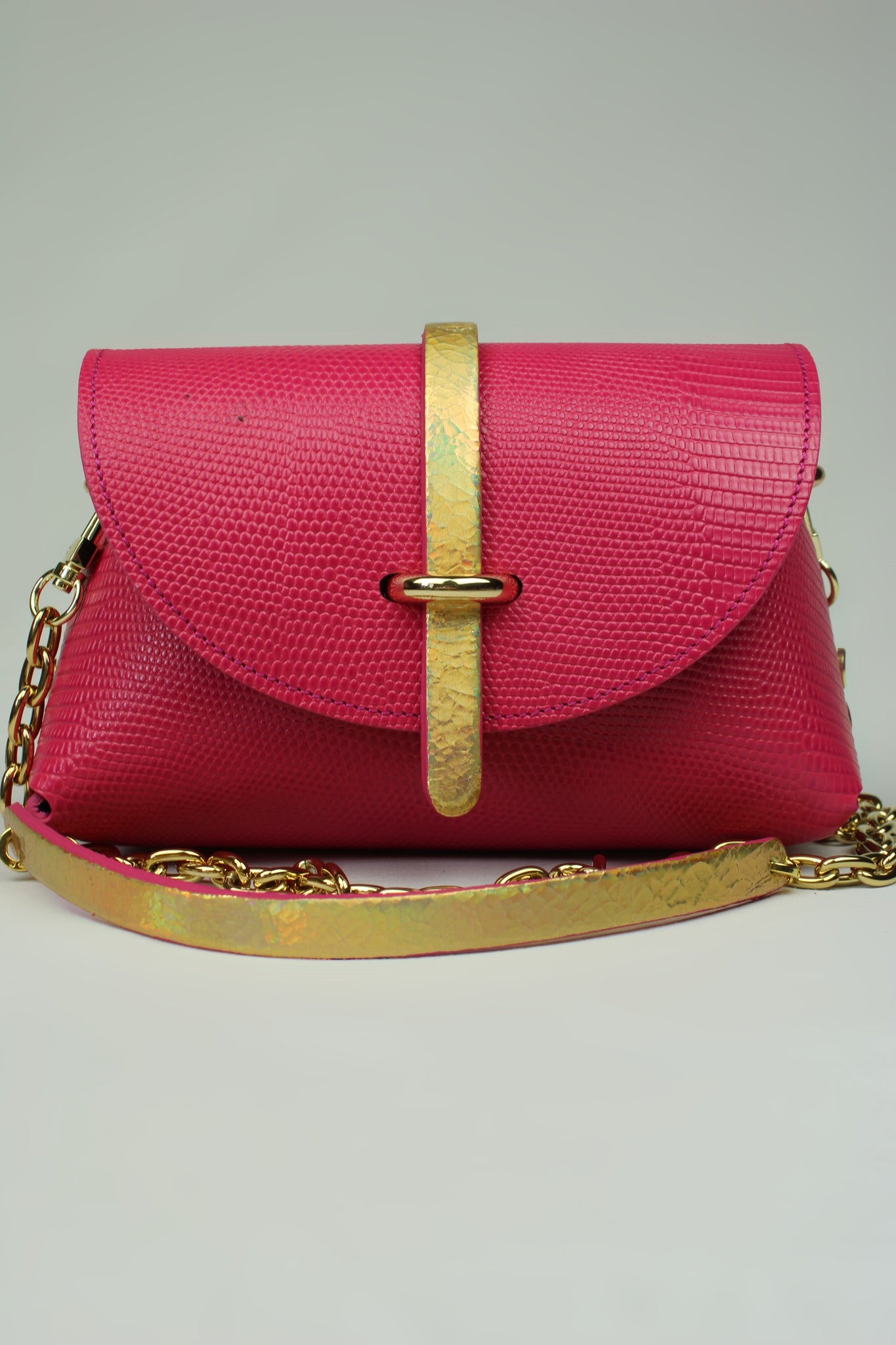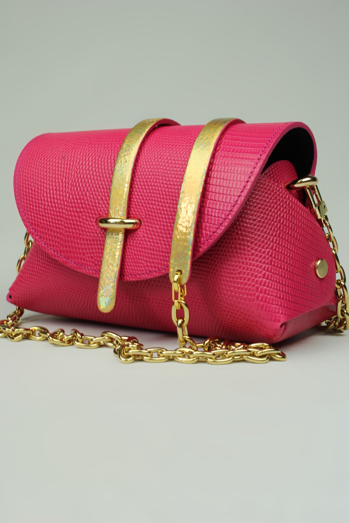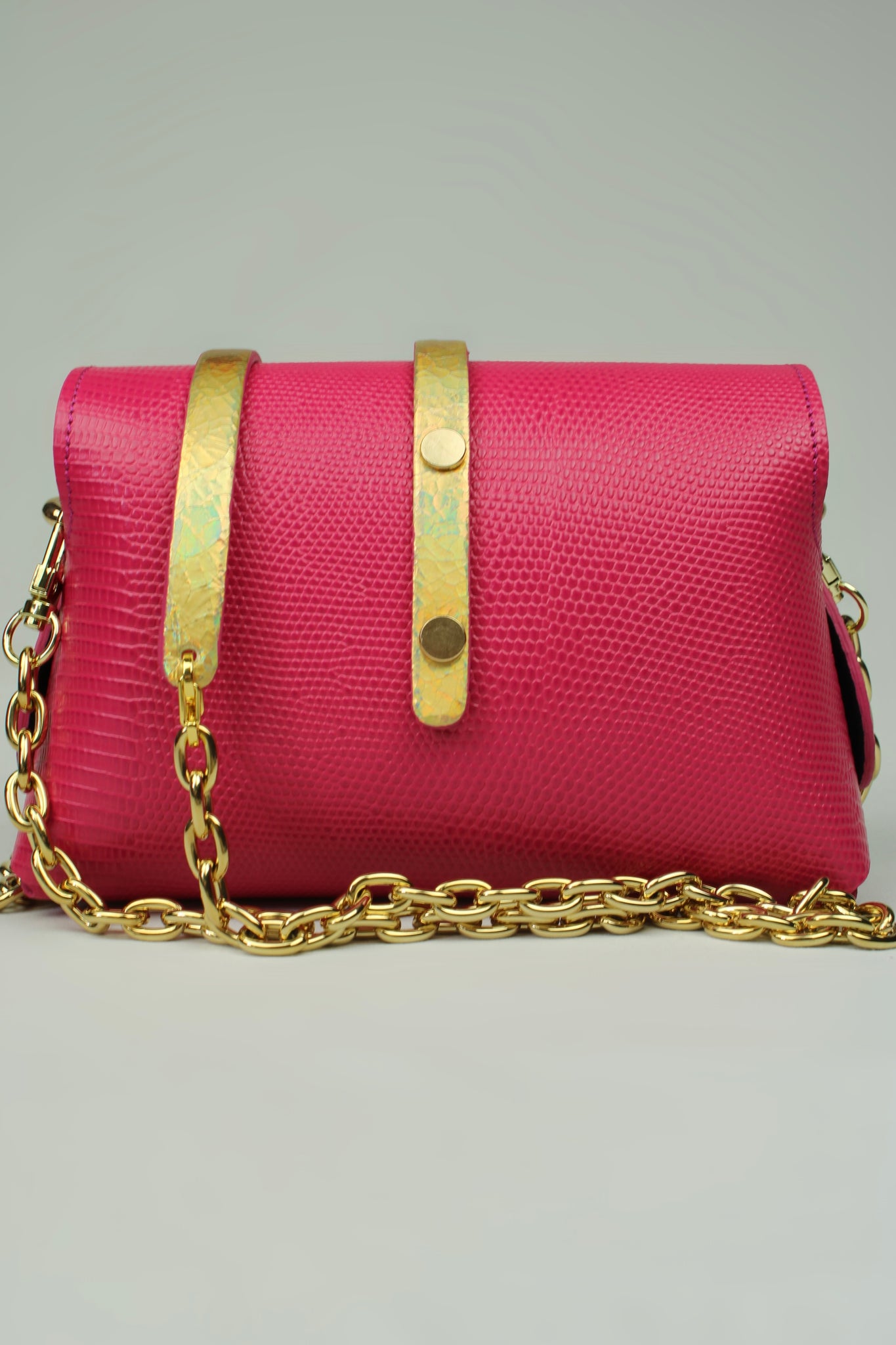 En cuir rose framboise impression serpent chèvre laminé , languette en cuir laminé holographique or