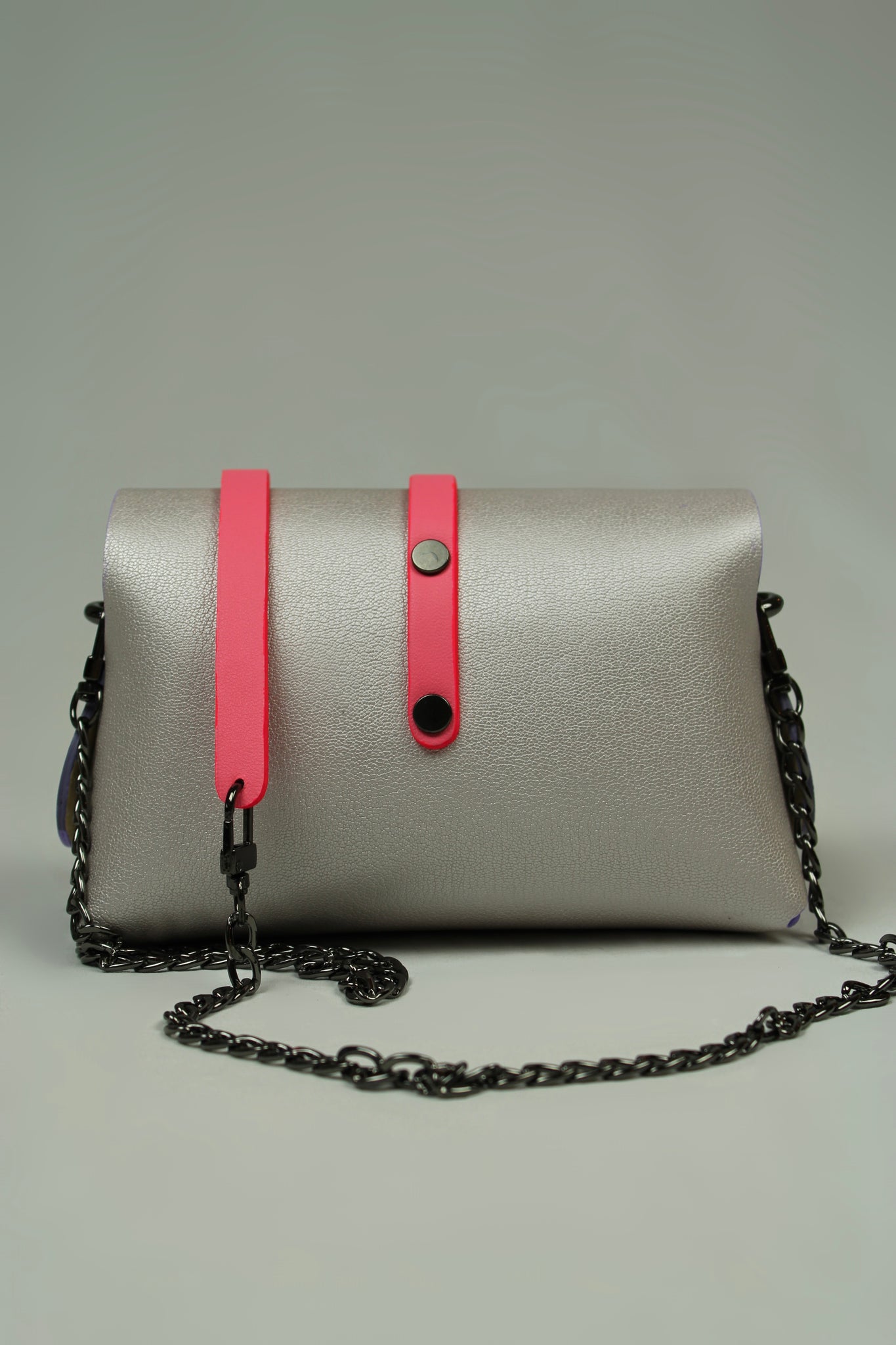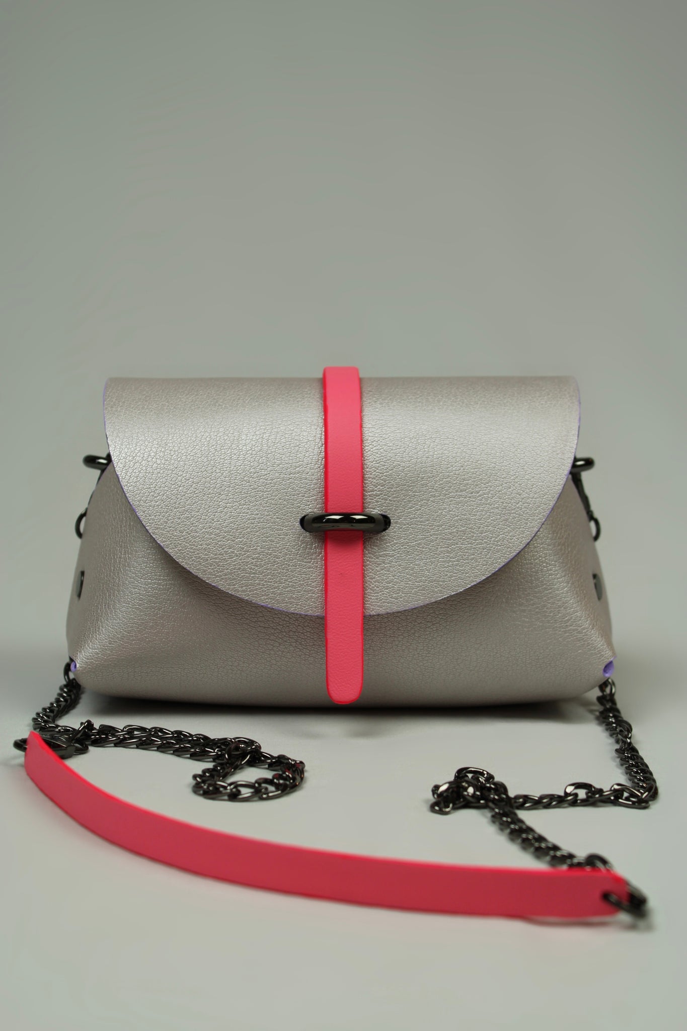 Made of pearly calfskin in iridescent lilac-grey, with a fluorescent pink grained leather tongue