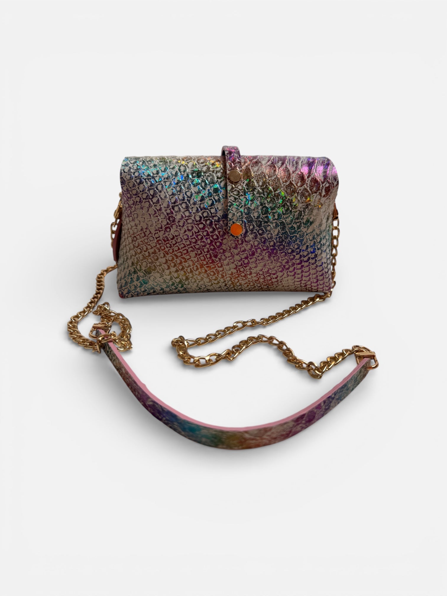 Made of Italian multi-colored dyed crocodile leather and calfskin leather