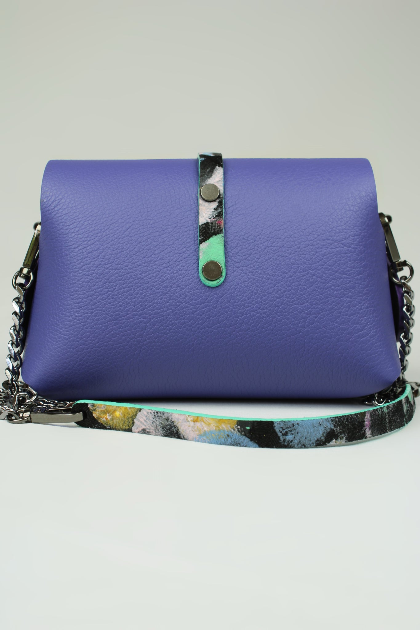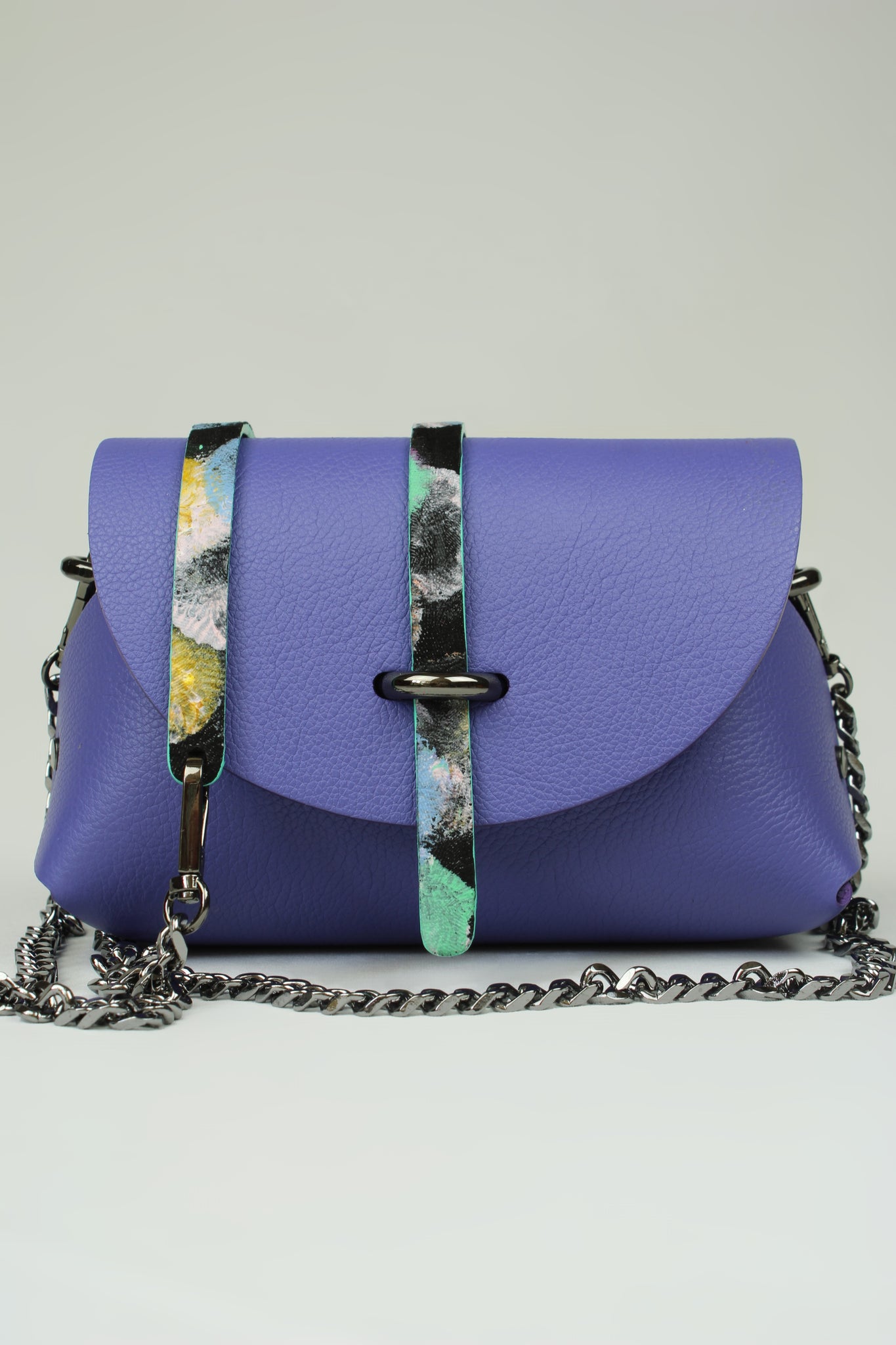 En cuir de veau couleur violet provenant d’une des plus anciennes tanneries Françaises. Un cuir premium, pleine fleur d’une qualité extraordinaire ! Languette bleu en cuir métallisé , chèvre laminé, entièrement peinte à la main .