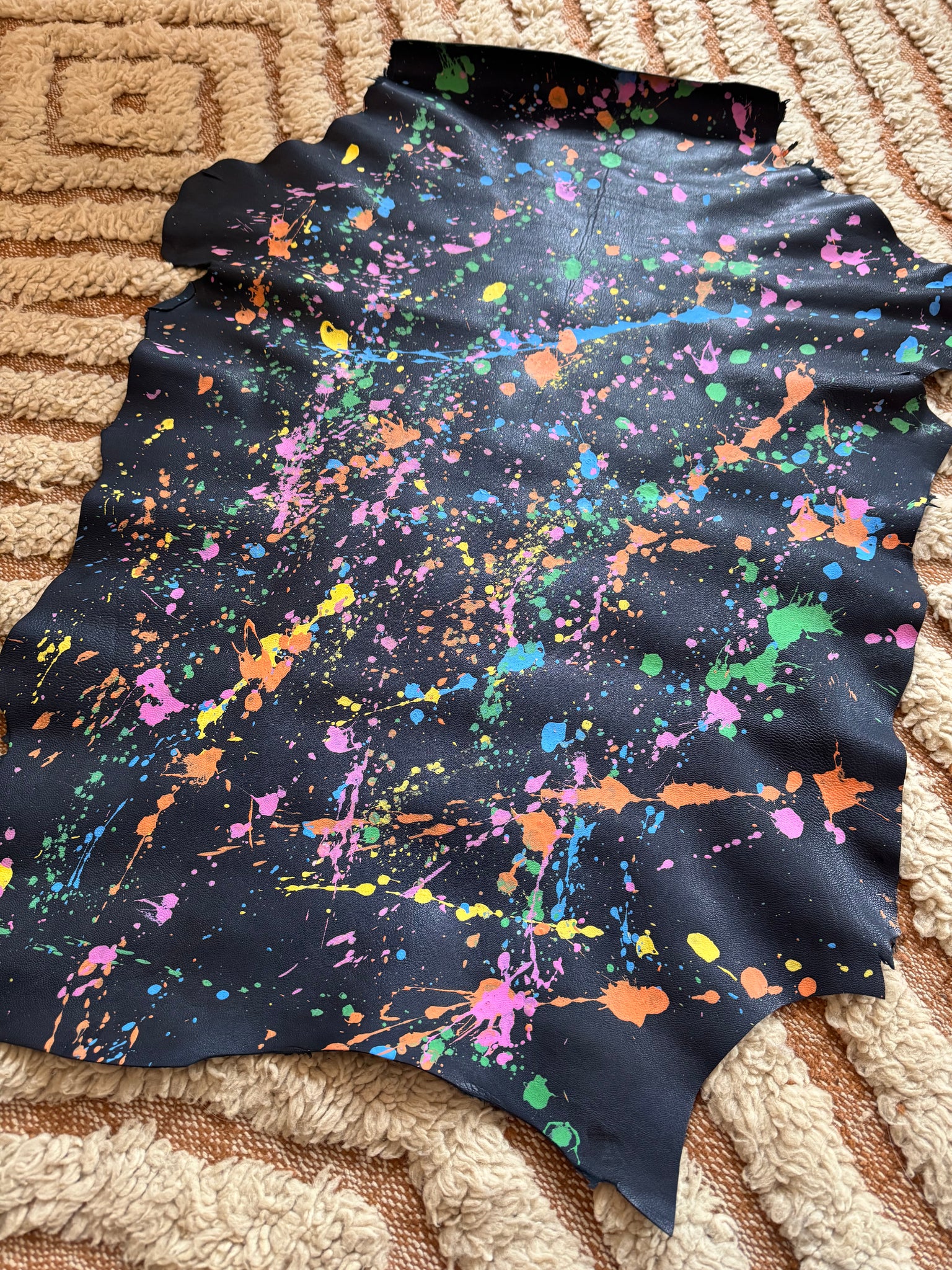 En cuir métallisé, chèvre laminé , entièrement peint à la main , le fond est un mélange de bleu marine et de noir