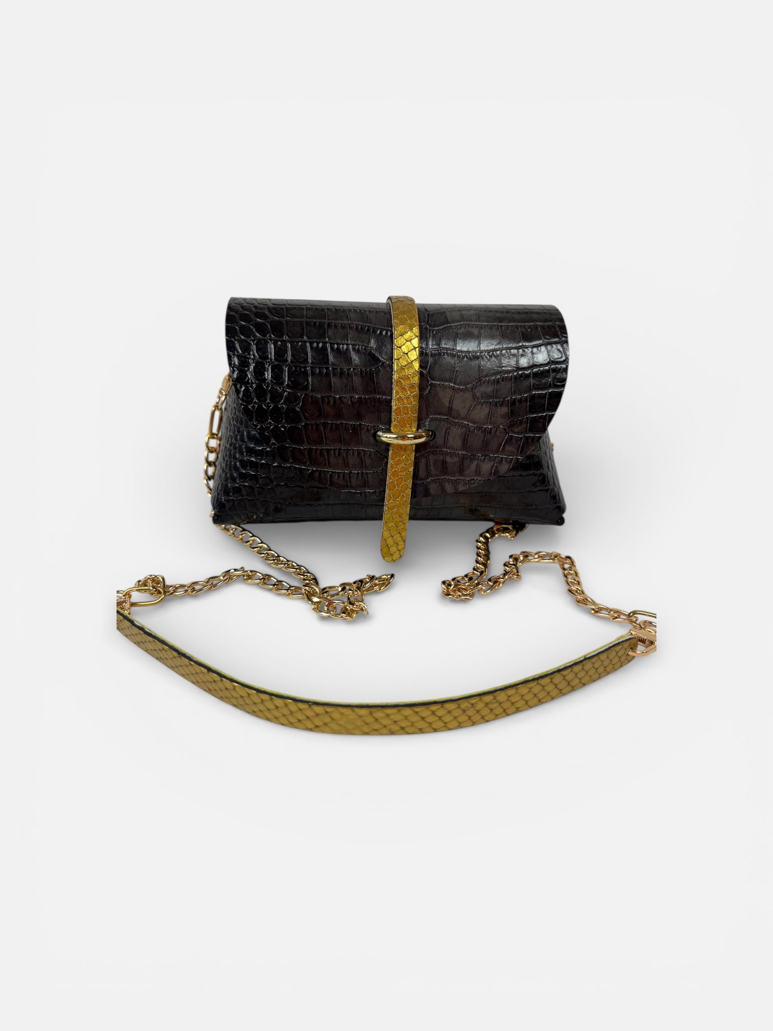 En cuir croco noir et gris , effet gris tie and dye , avec une chèvre laminé et sangle serpent doré