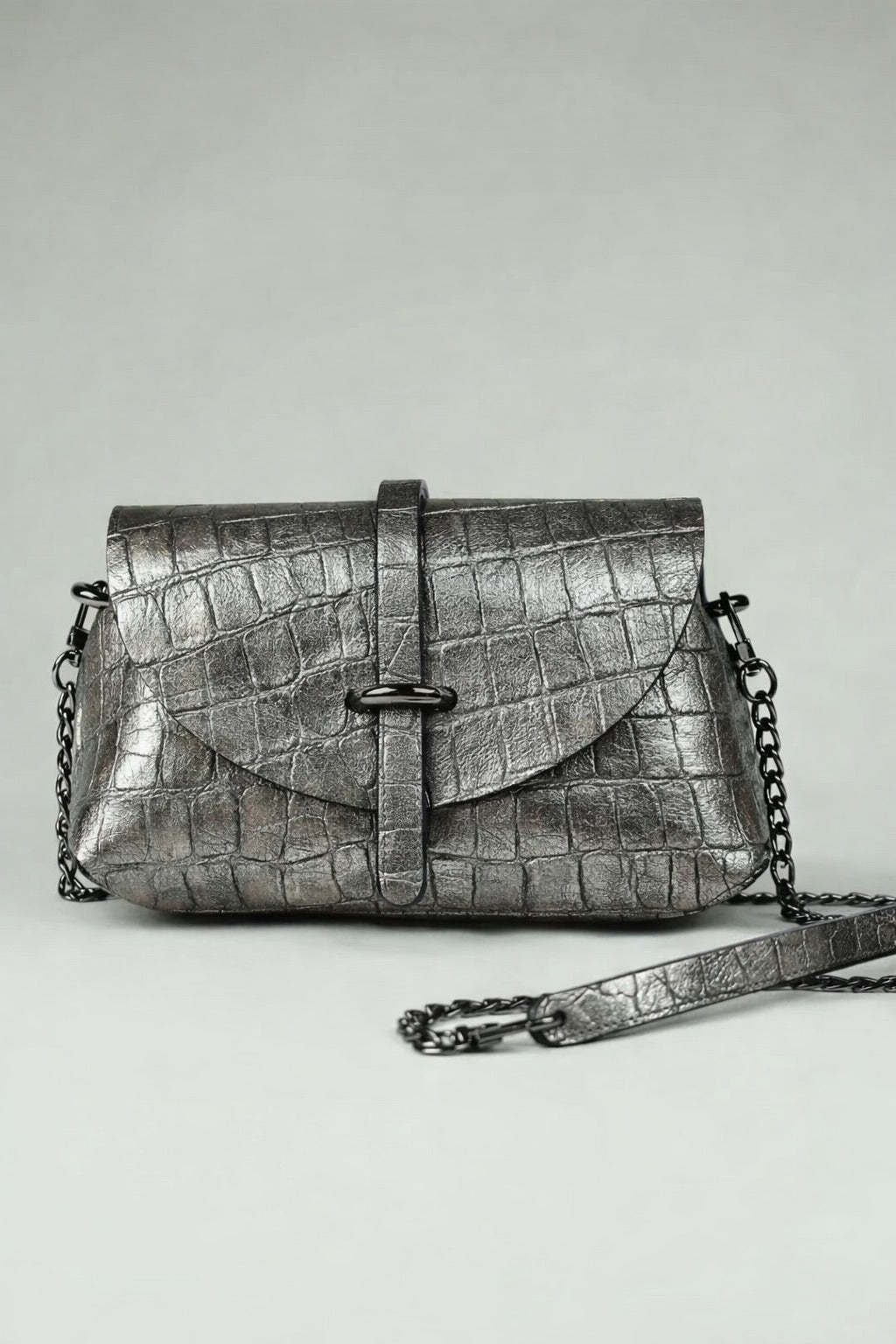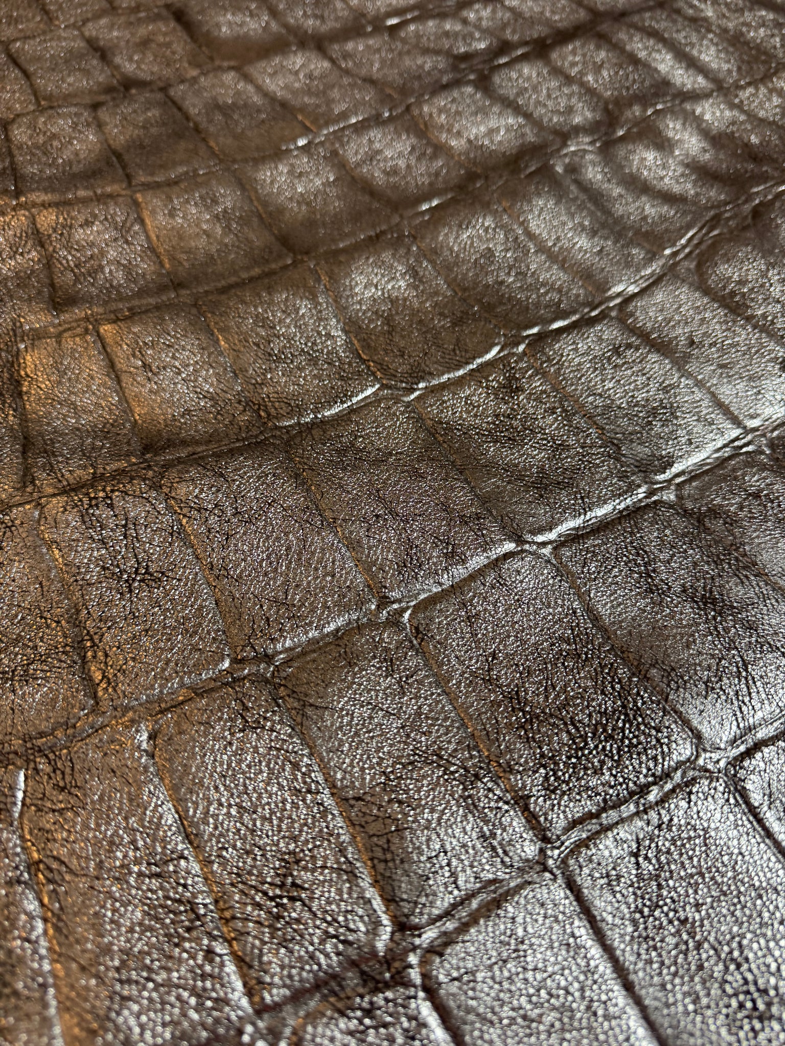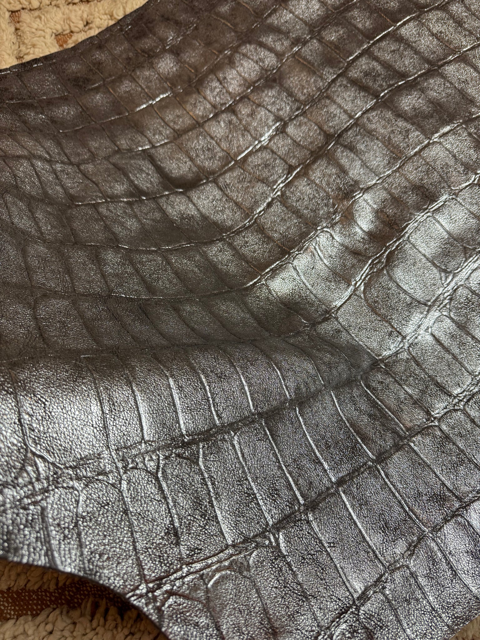 En cuir croco argenté irisé , vintage , chèvre laminé .