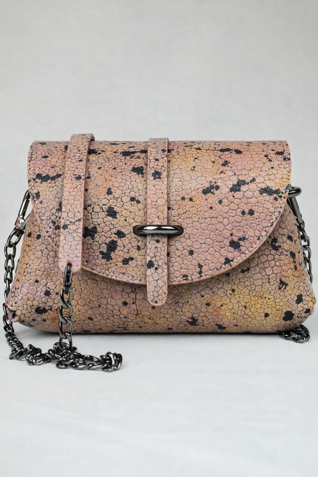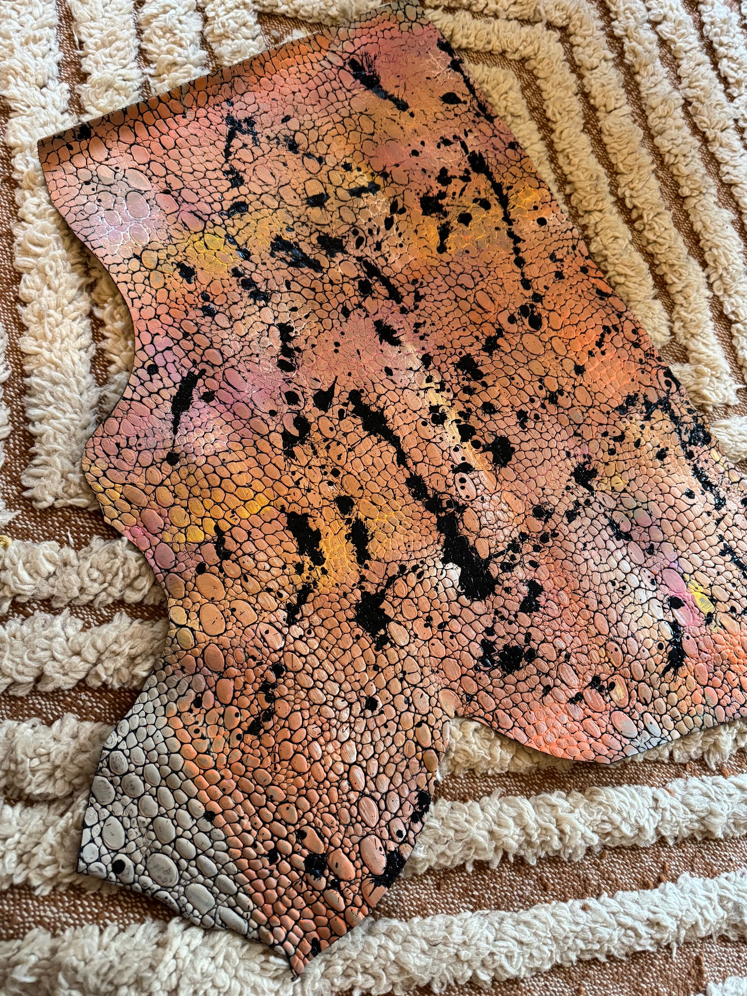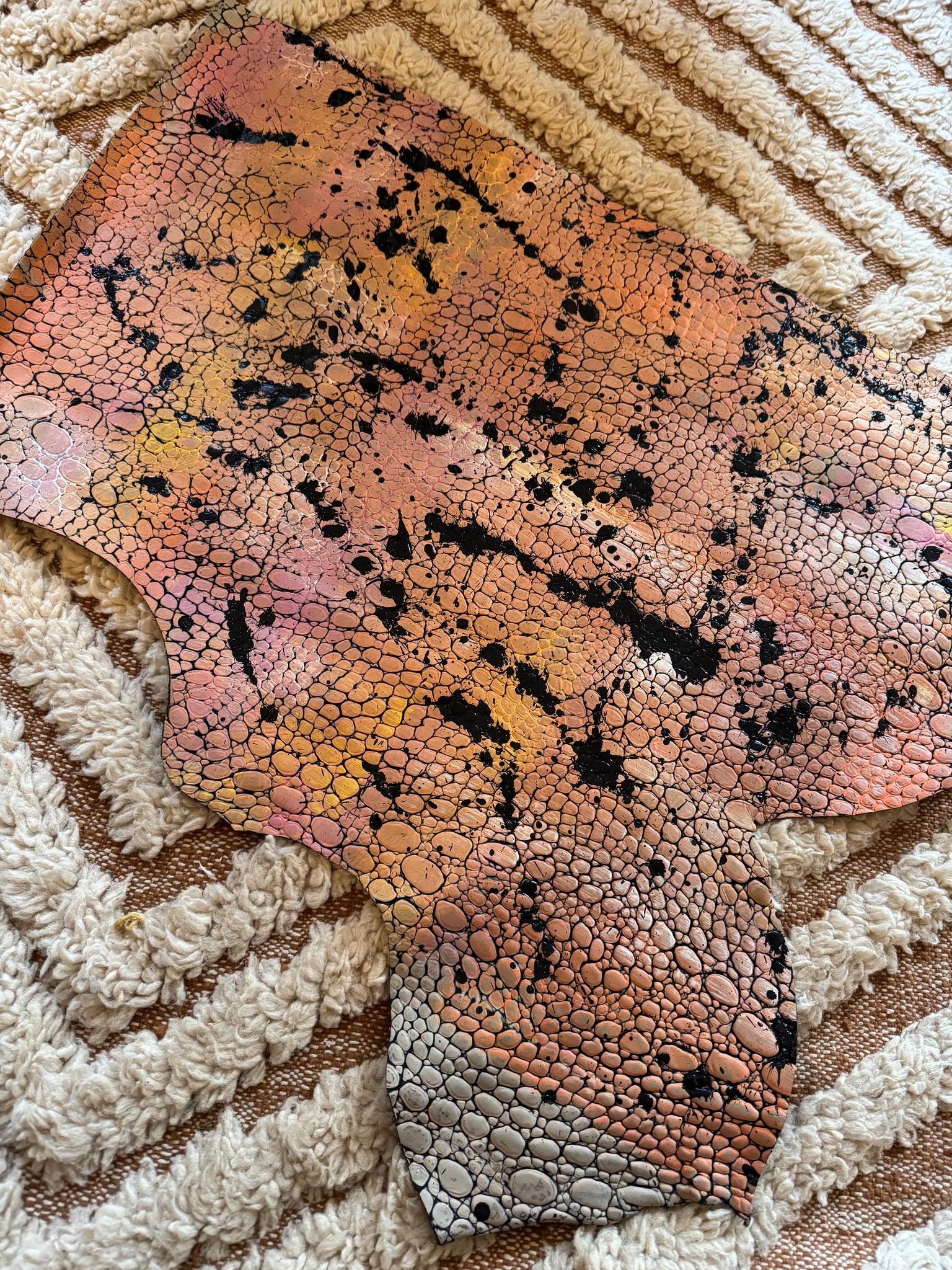 En cuir de veau façon croco, tout en relief gauffré , entièrement peint à la main