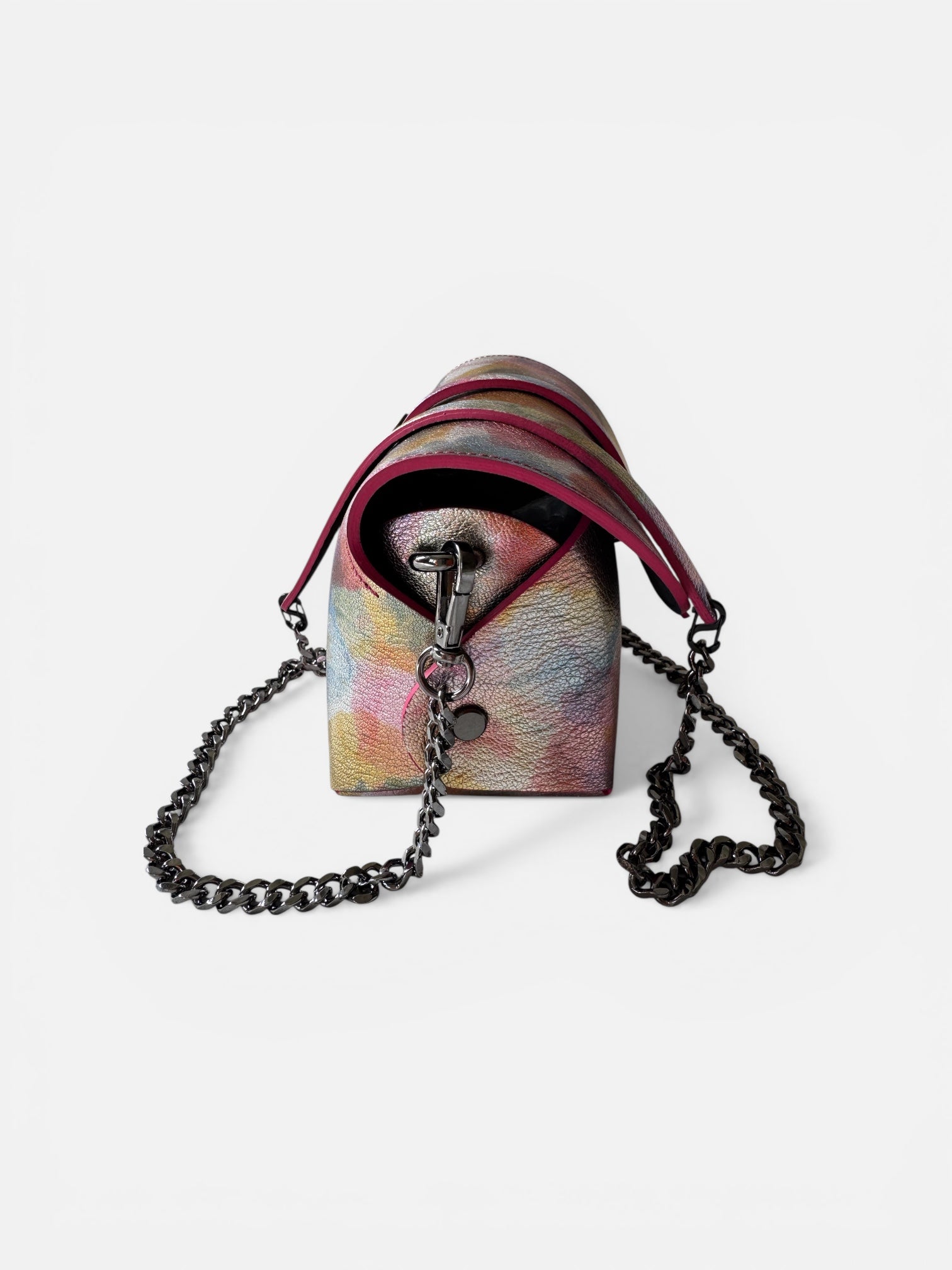 En cuir Italien, veau velours cuir irisé holographique , brillant , multicolore , reflet qui change avec la lumière et le soleil ,