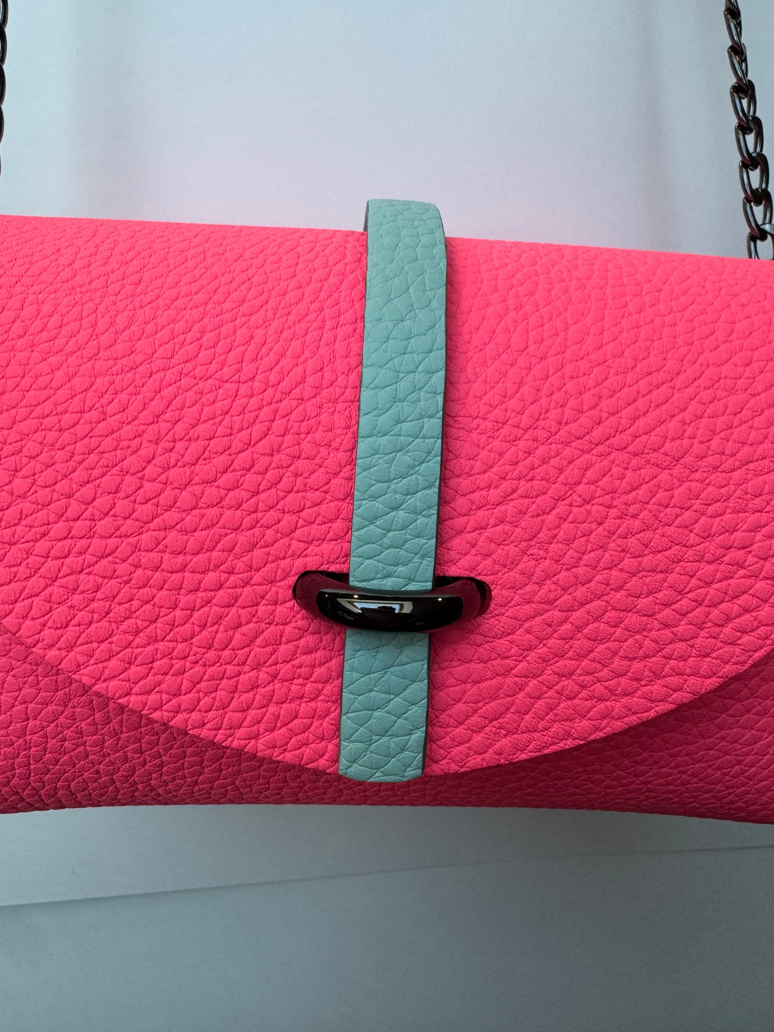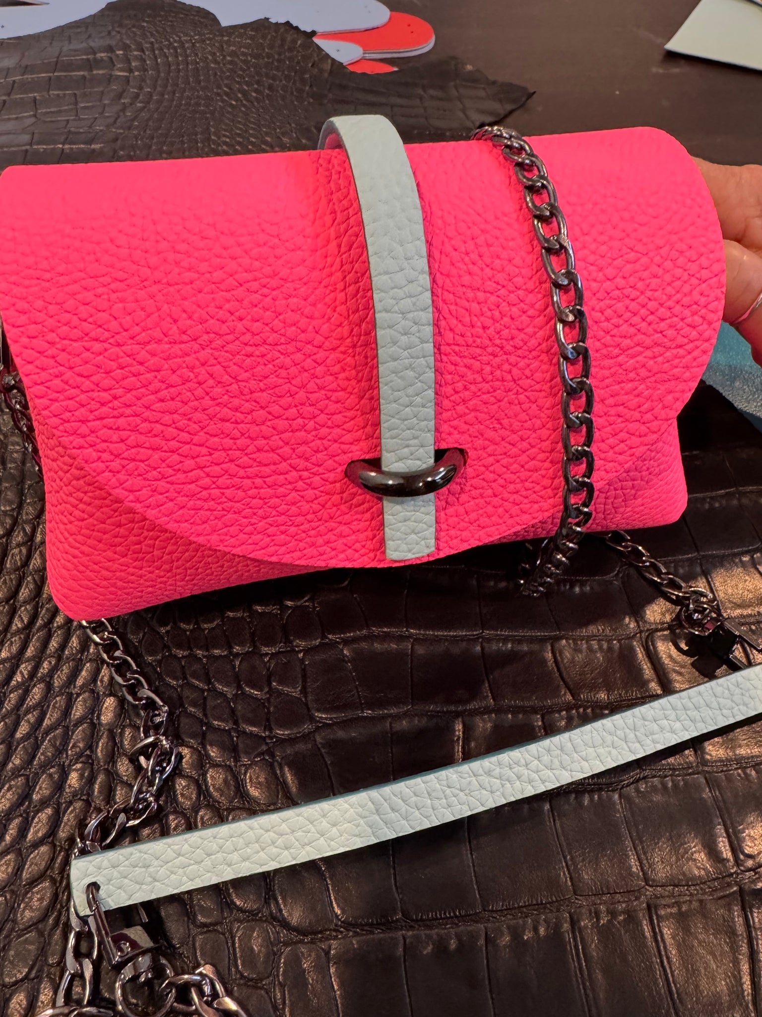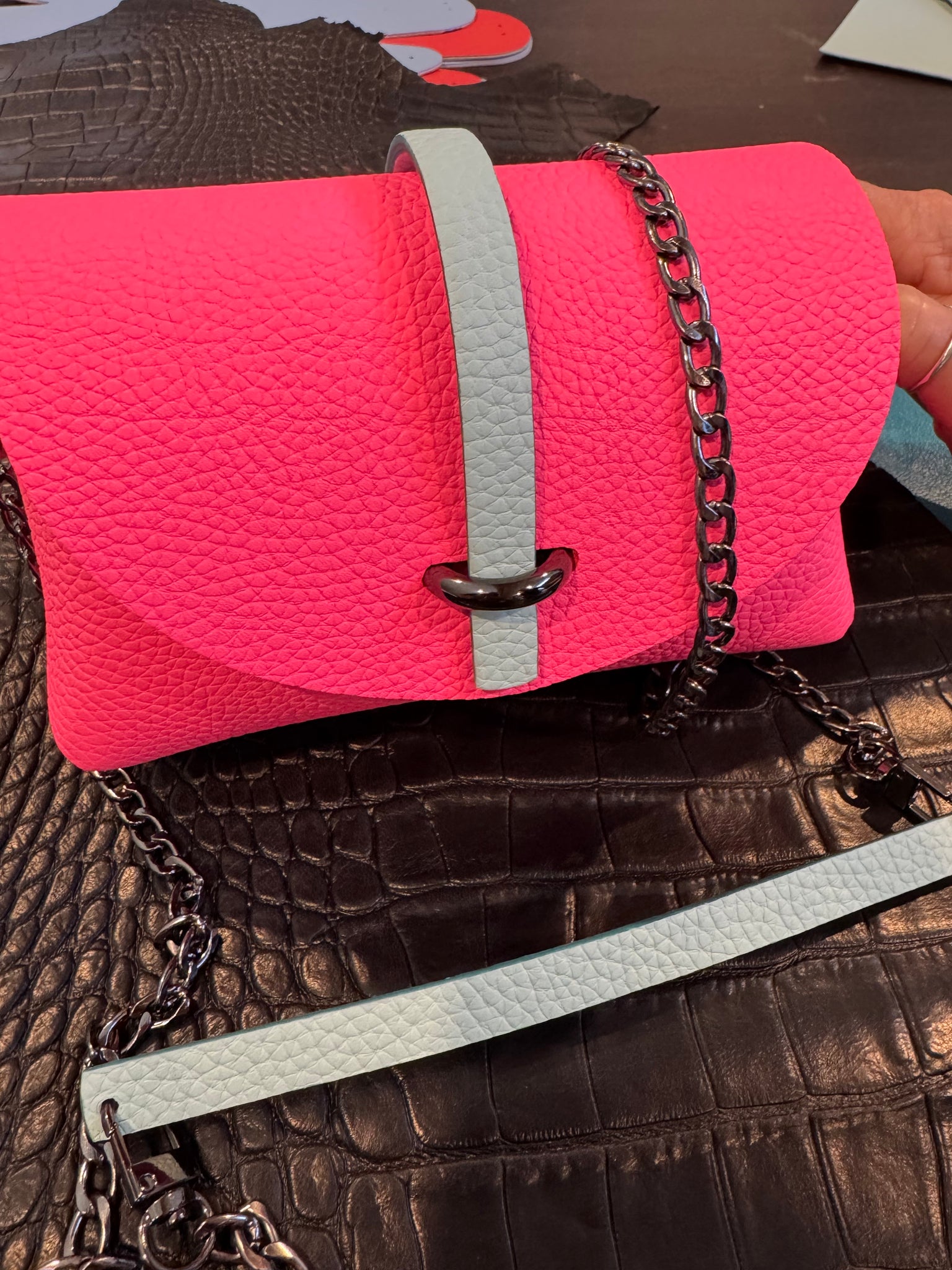 Voici notre deuxième merveille , tout en cuir , rose fluo ! Il a une languette bleue ! Vous savez bien, la couleur, c’est la vie !!! Il est canon ! ChaĂ®ne en mĂ©tal argentĂ© noir  ! Tellement chic ! C’est une bombe atomique et nous en sommes très fières ! J’espère que vous aurez envie de le porter Ă votre tour et de l’adopter et qu’il fera parti de vos indispensables ! Il  a Ă©tĂ© fait en petite quantitĂ© ! Il y en a 3 !Â