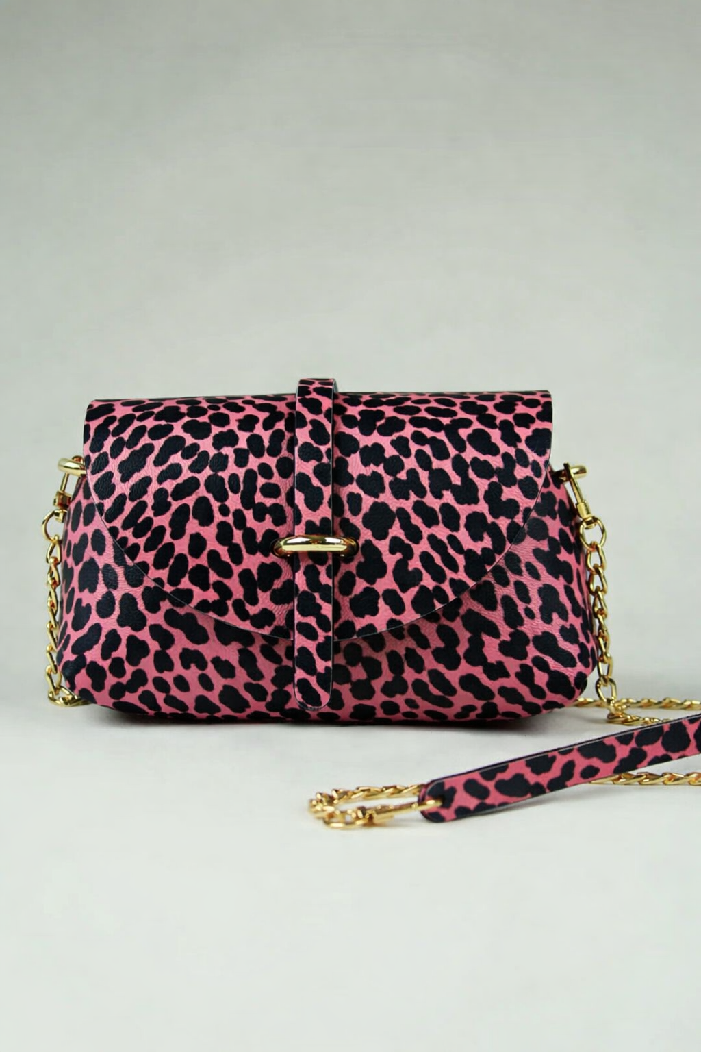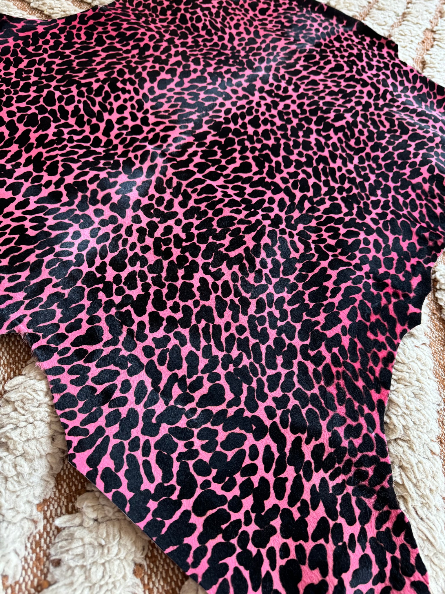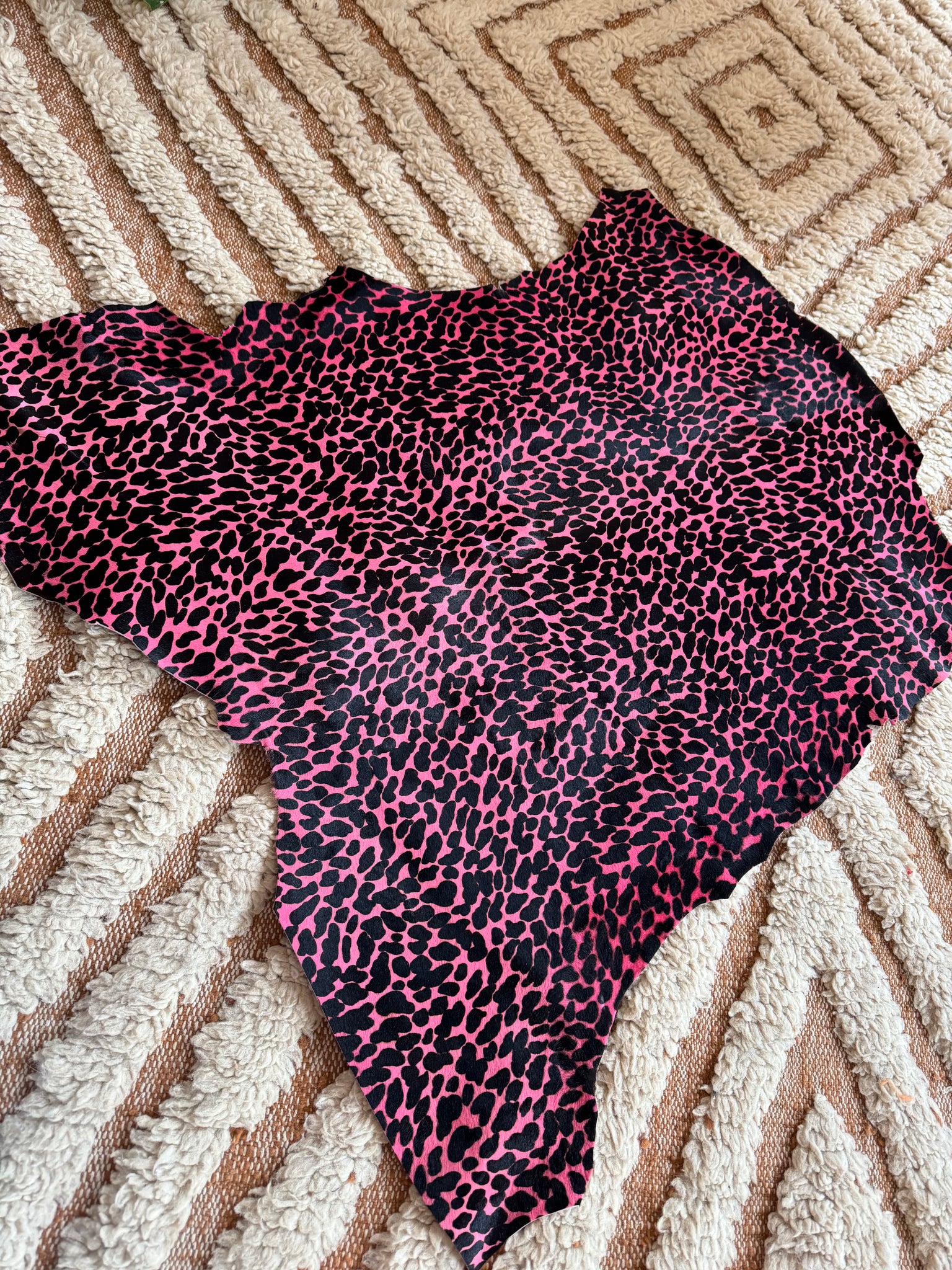En cuir de veau, texture façon poney , fond noir imprimé léopard rose