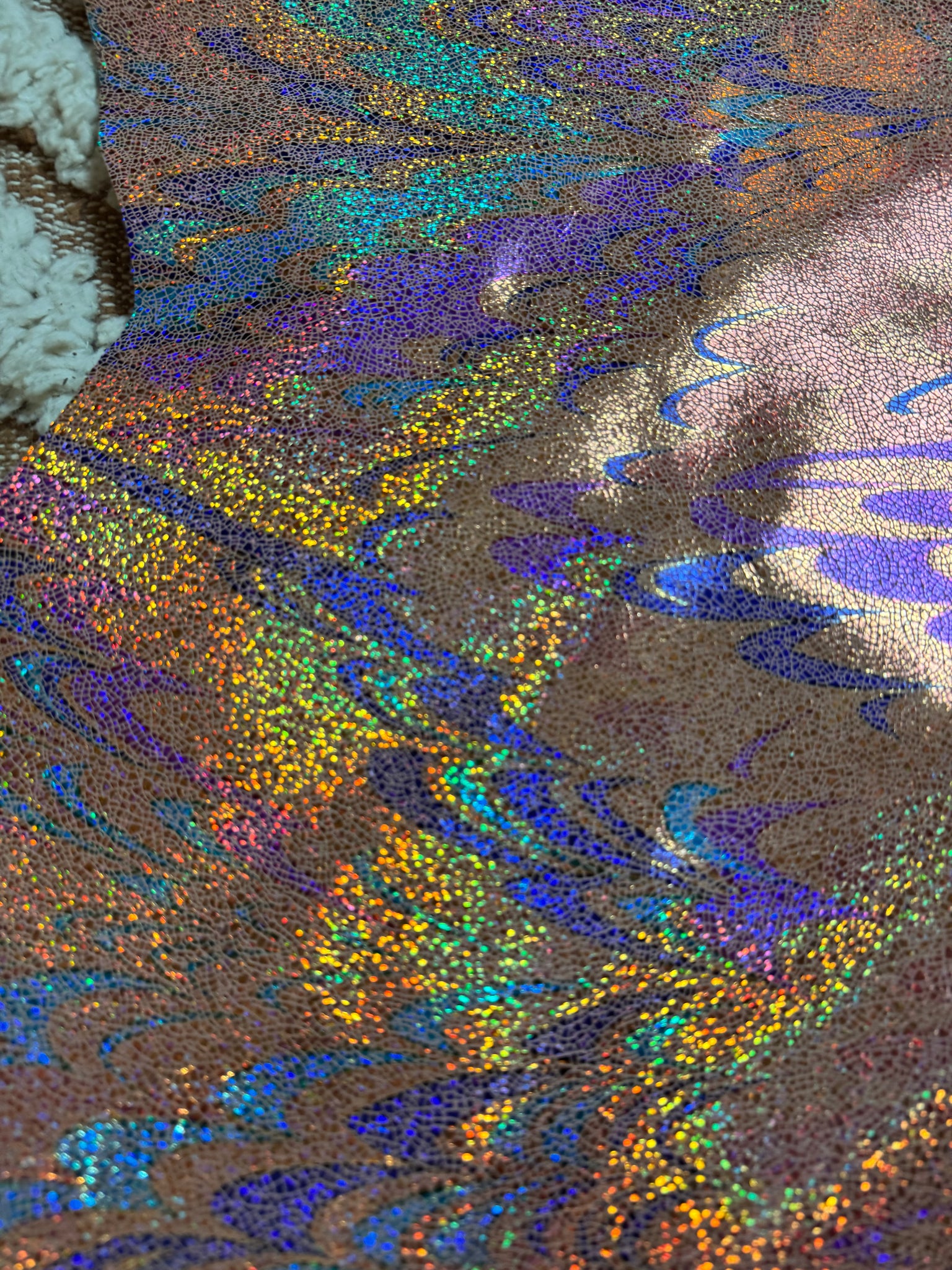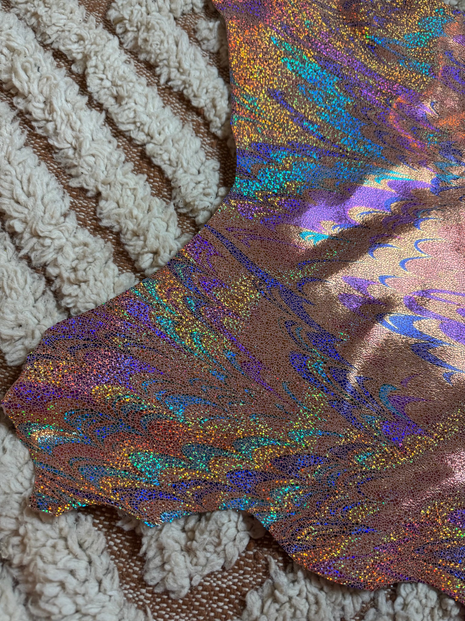 En cuir laminé imprimé holographique , multi colore , esprit boule à facettes , brillant irisé , effet pailleté , par endroit comme un effet plume de paons .