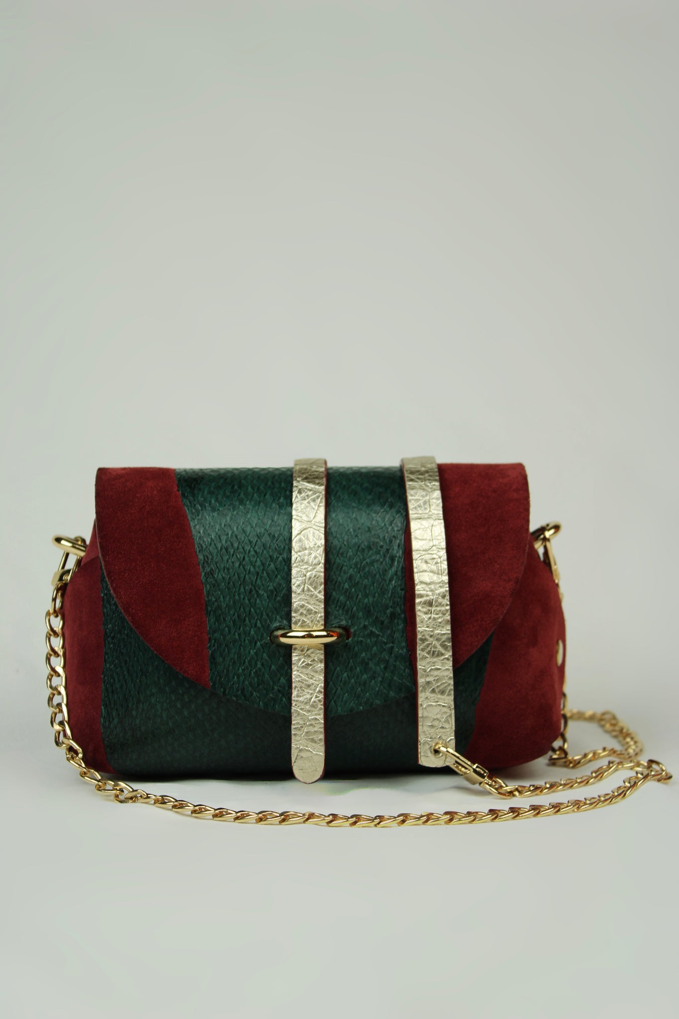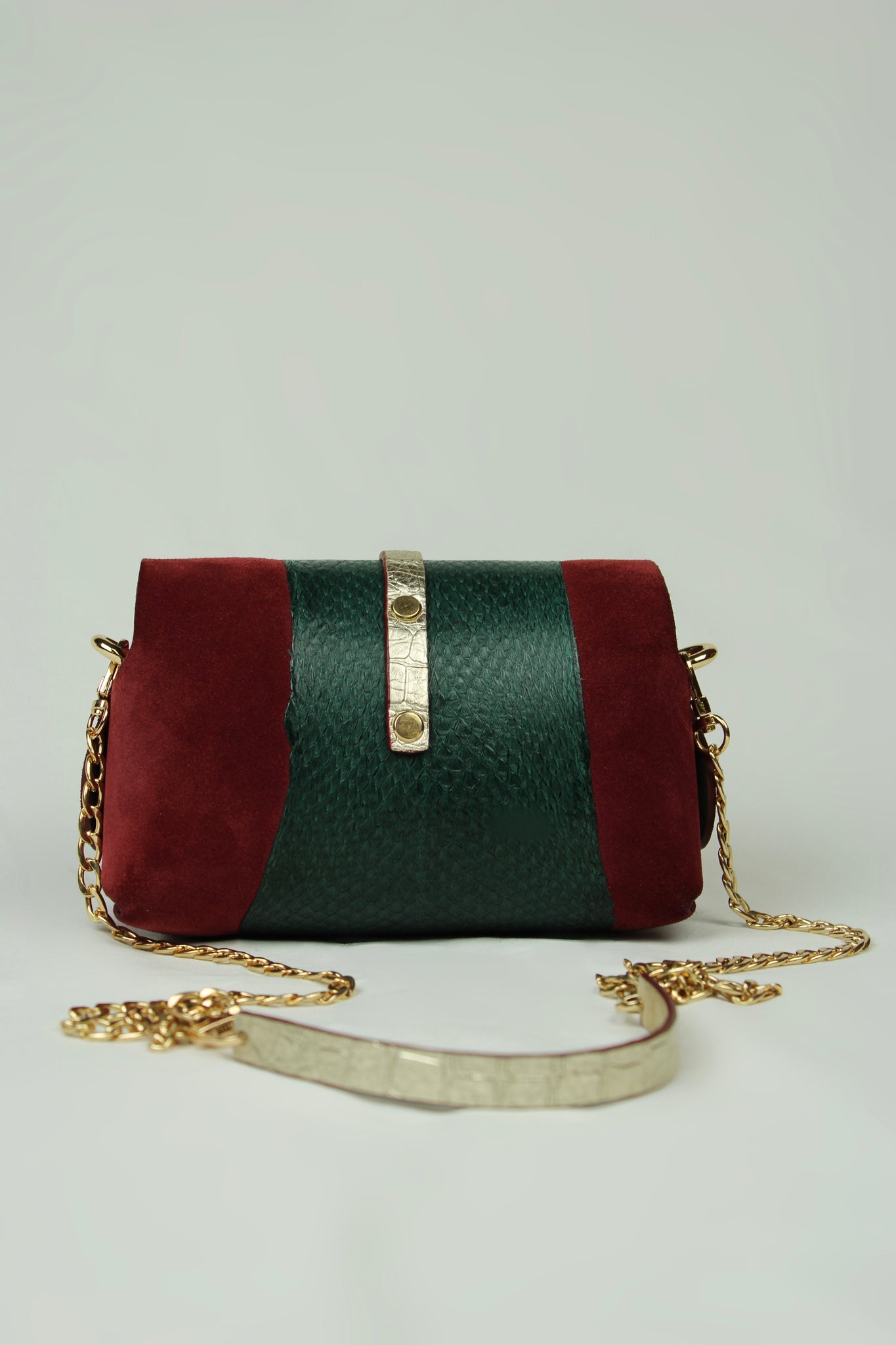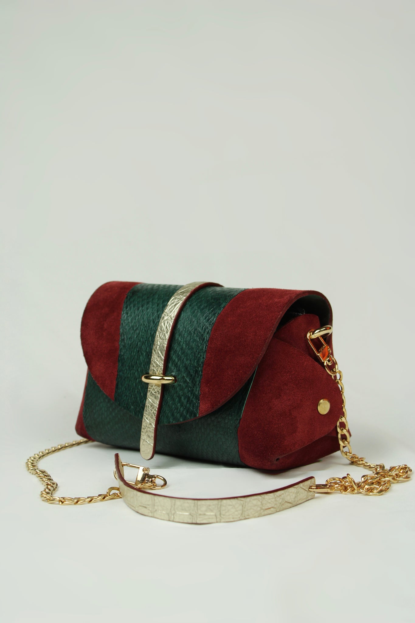 En cuir de veau , daim couleur bordeaux et empiècement avec saumon teinté vert , languette cuir croco doré