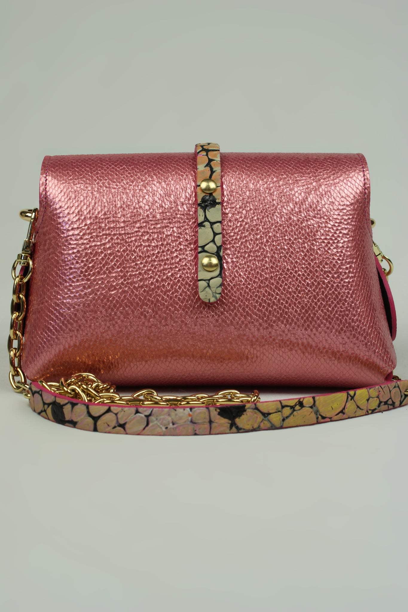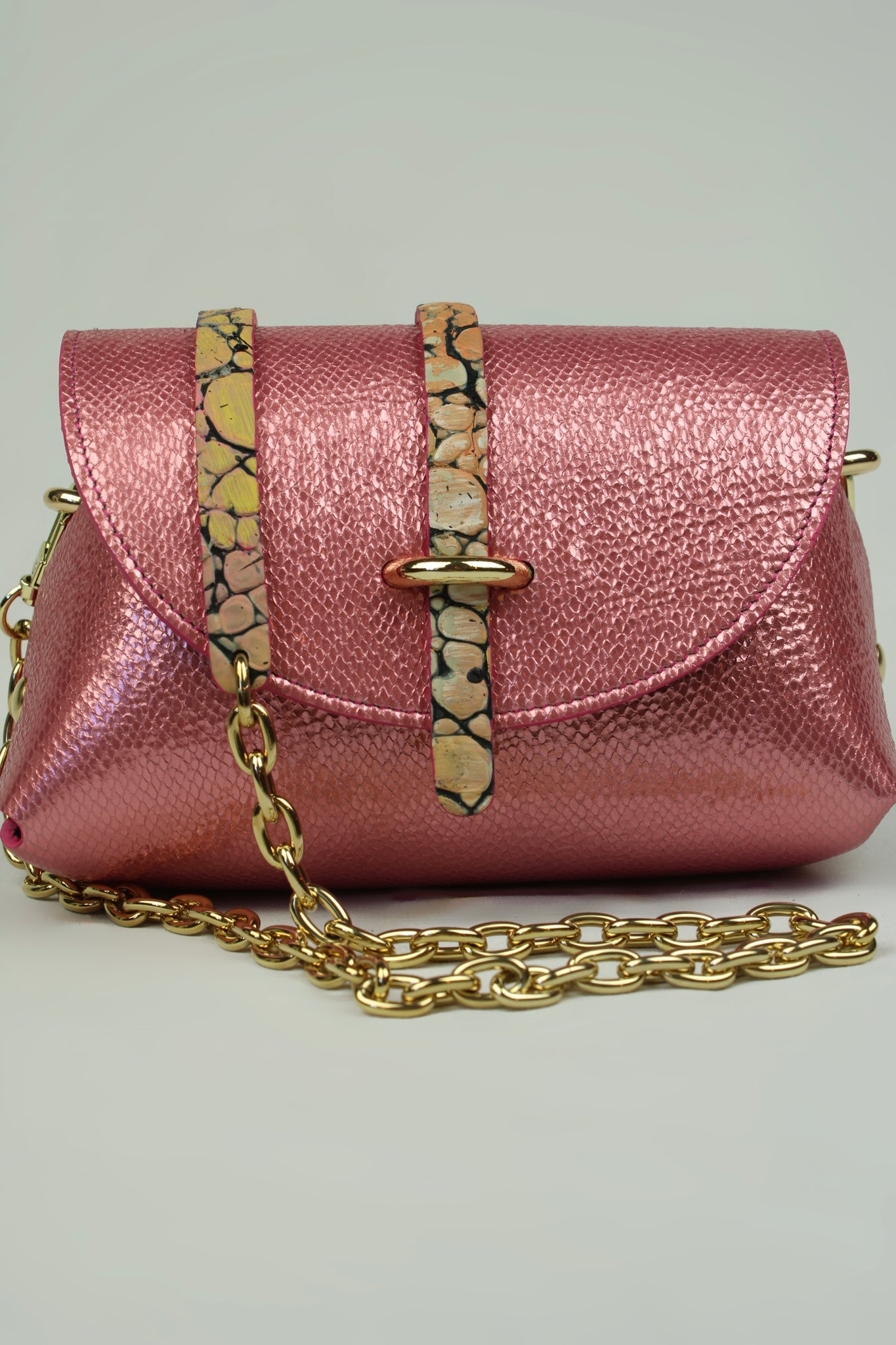 En cuir métallisé gauffre couleur rose , chèvre laminé , languette en cuir de veau façon croco tout en relief gauffre et entièrement peint à la main