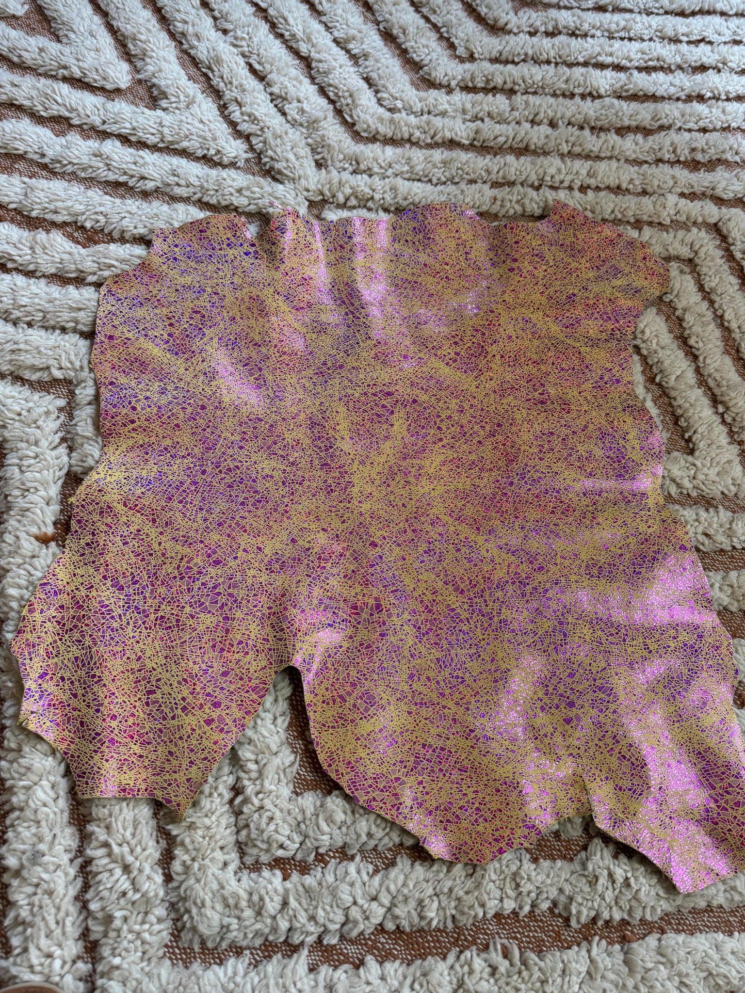 En cuir laminé imprimé multicolore , cuir de chèvre métallisé sur base en suedine jaune , couleur grenat , framboise, doré